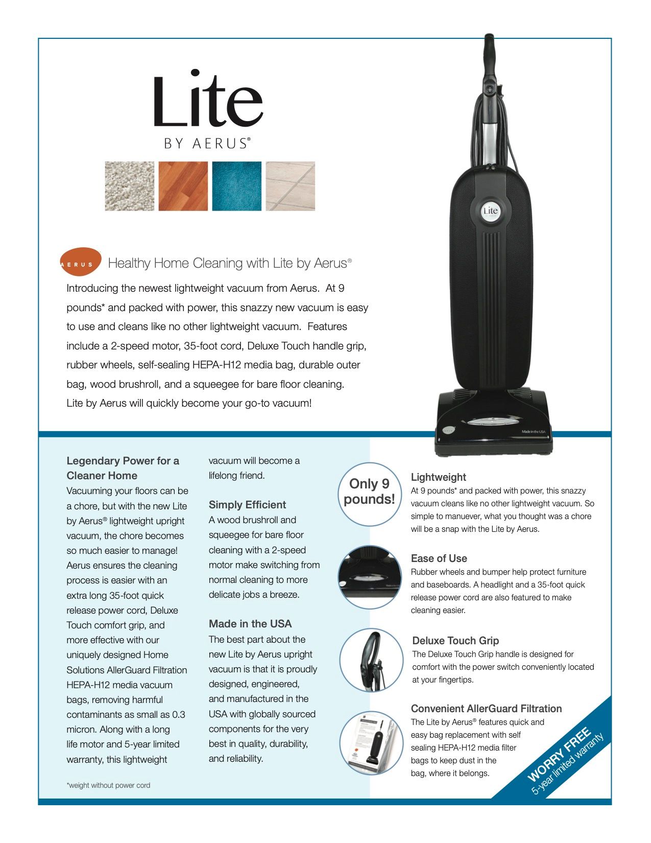 Lite by Aerus makes cleaning simple, fast, and more effective with AllerGuard Filtration HEPA-H12 media vacuum filter bags, removing harmful contaminants as small as 0.3 micron from the air.