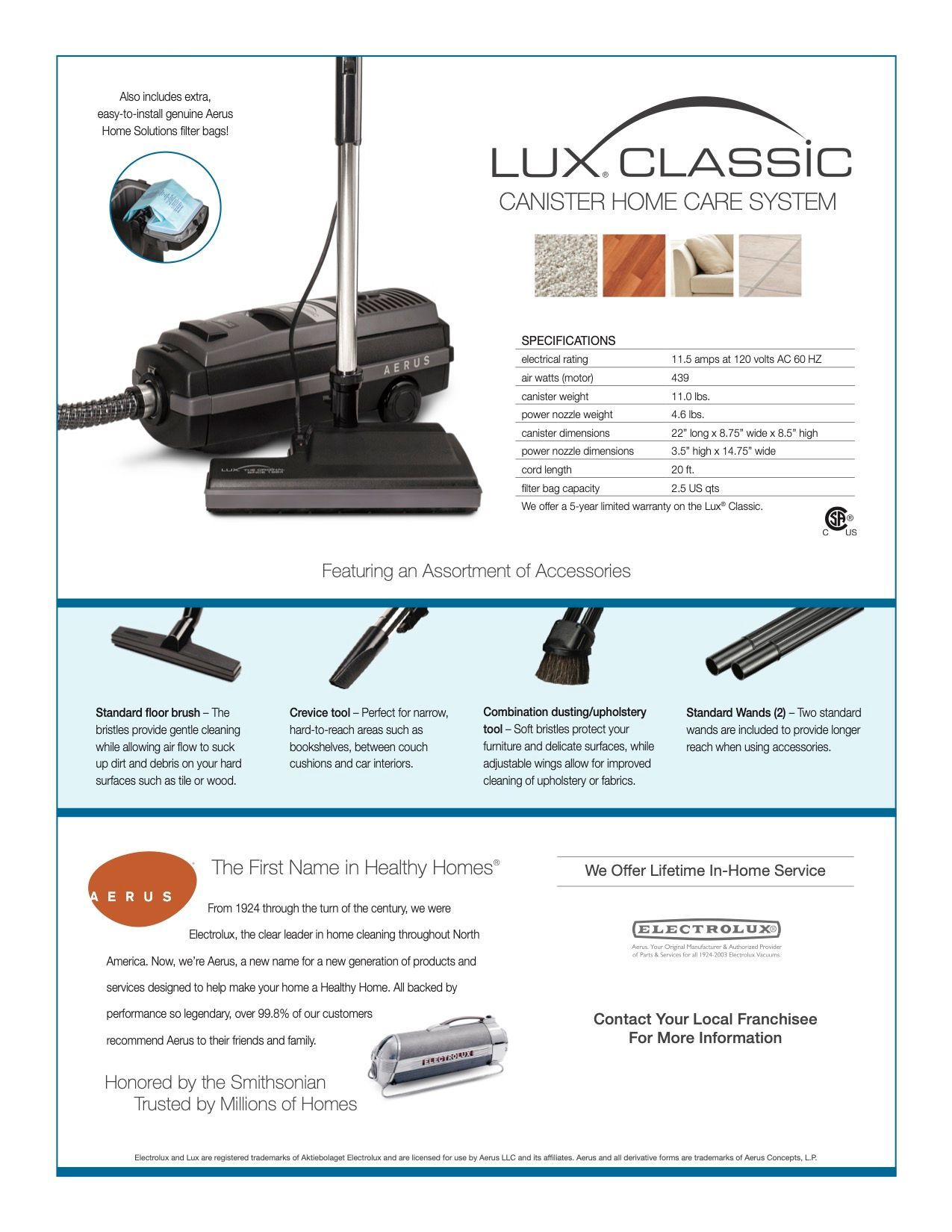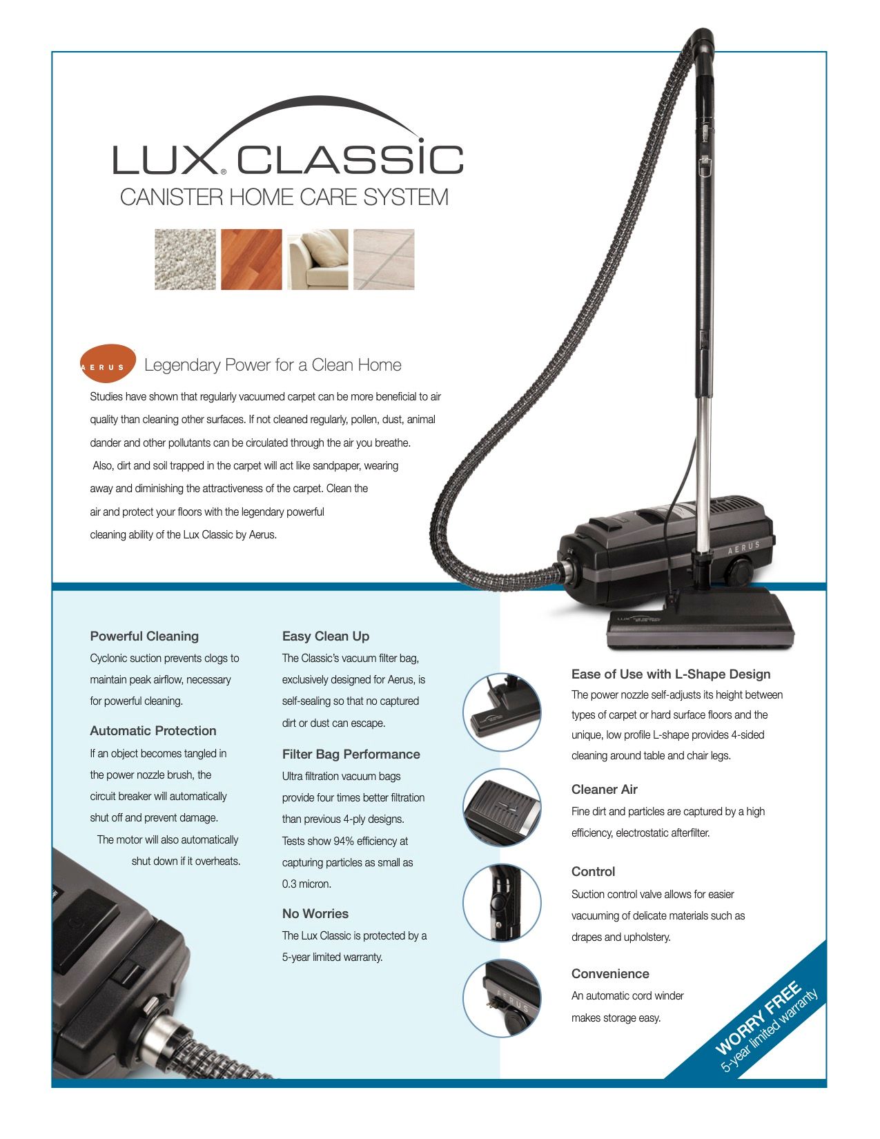 Protect your floors and purify the air with the Lux Classic by Aerus: powerful, adaptable cleaning for carpets and hard surfaces alike.